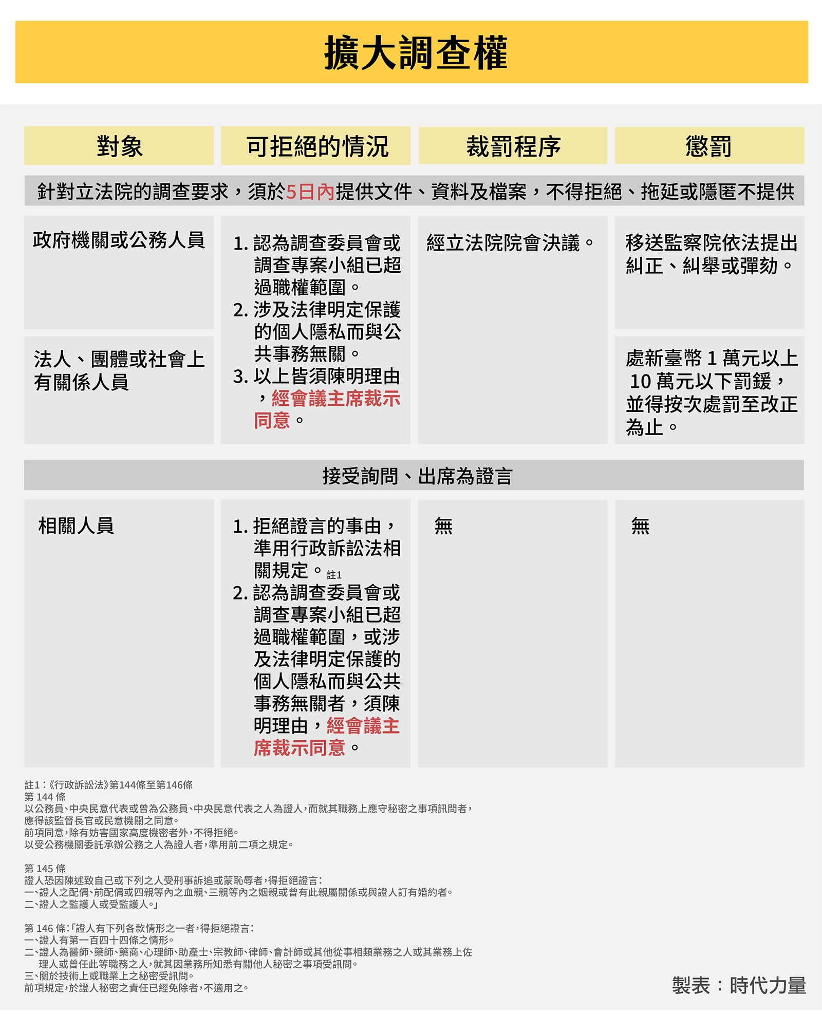藍白三讀版中,明定立法院調查委員會或調查委員小組可以要求政府機關、部隊、法人、團體或社會上有關係人員提供相關資料,並且於必要時,相關人員應接受詢問、出席進行證言。因此,此次修正法案強化調查權的規定,影響會及於社會大眾,不得不慎。