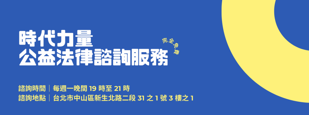 公告:2025 年時代力量中央黨部公益法律諮詢服務 2025-11-27 時代力量中央黨部公益法律諮詢服務 諮詢時間:每週一 19:00–21:00諮詢地點:台北市中山區新生北路二段 31 之 1 號 3 樓之 1預約方式:電話預約:02-2250-3225(來電請說:我要預約法律諮詢)直接私訊「時代力量 New Power Party 」粉專,留下「姓名/聯絡方式/案由摘要/預約時段」,待黨部回覆即可。 公益法律諮詢律師名單郭鴻儀 律師|房角石法律事務所主持律師林巧雯 律師|家族信託規劃顧問師/東吳大學法律碩士慕宇峰 律師|慕恆法律事務所主持律師/國立臺北大學犯罪學碩士/新竹律師公會副秘書長陳昱維 律師|昱欣法律事務所主持律師/國立中正大學法學士何蔚慈 律師|臺灣大學法律碩士洪婉珩 律師|天晴和永國際商務法律事務所律師/東吳大學法律碩士/現任台北律師公會性別平等委員會主任委員 注意事項 請務必「事先預約」以免現場撲空,為維護服務品質「不開放」現場臨時登記。 請攜帶或預先提供相關文件(契約、收據、判決、聊天紀錄等),讓律師更快掌握重點。 每人每案 20 分鐘。 標籤黨務公告 黨務新聞