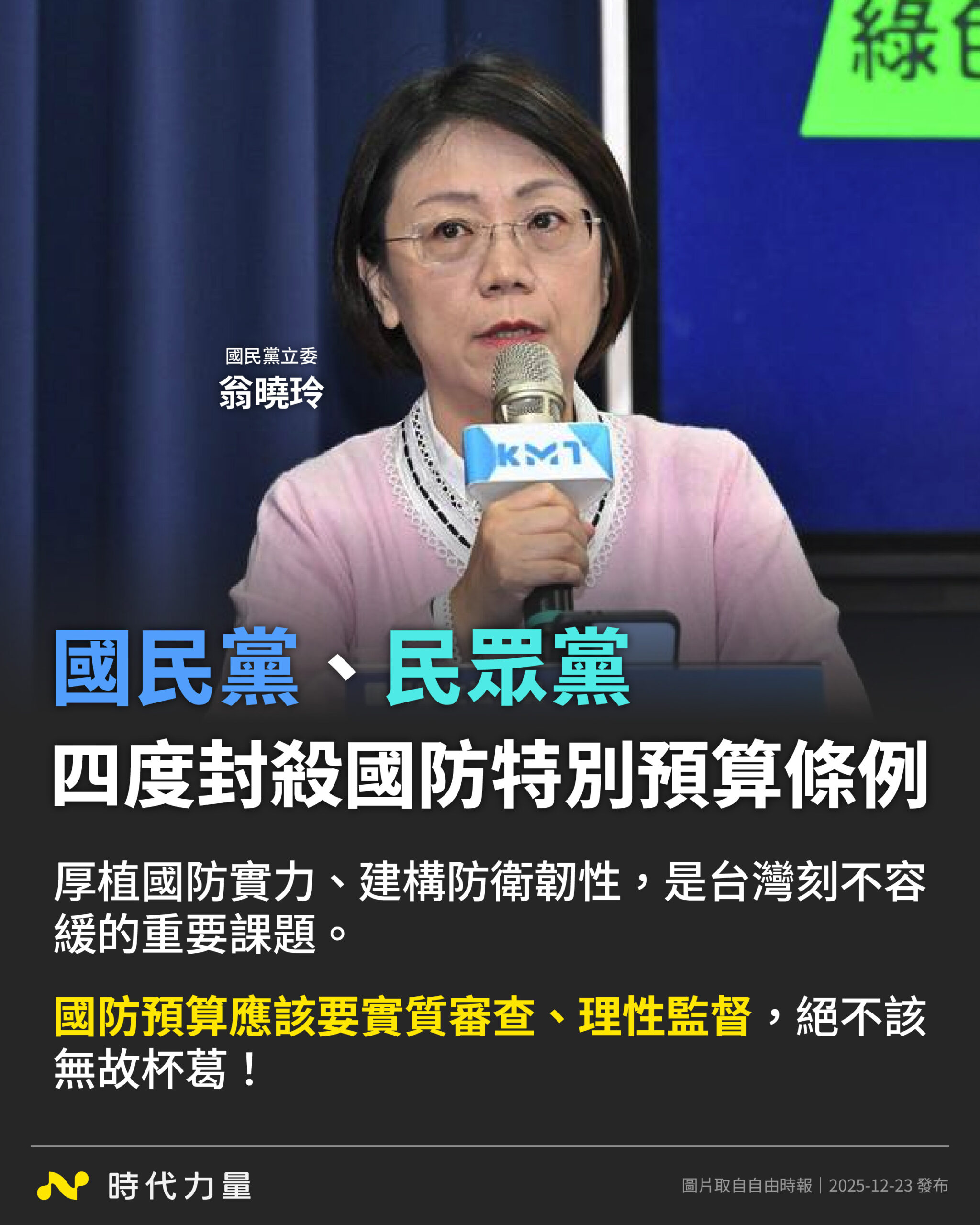 藍白四度封殺 1.25 兆國防特別條例。時代力量痛批,翁曉玲甫見完國台辦,回台即擋預算,質疑是配合中共指示,解除台灣武裝。呼籲藍白停止程序惡意杯葛,應回歸實質審查,勿拿國安當籌碼。