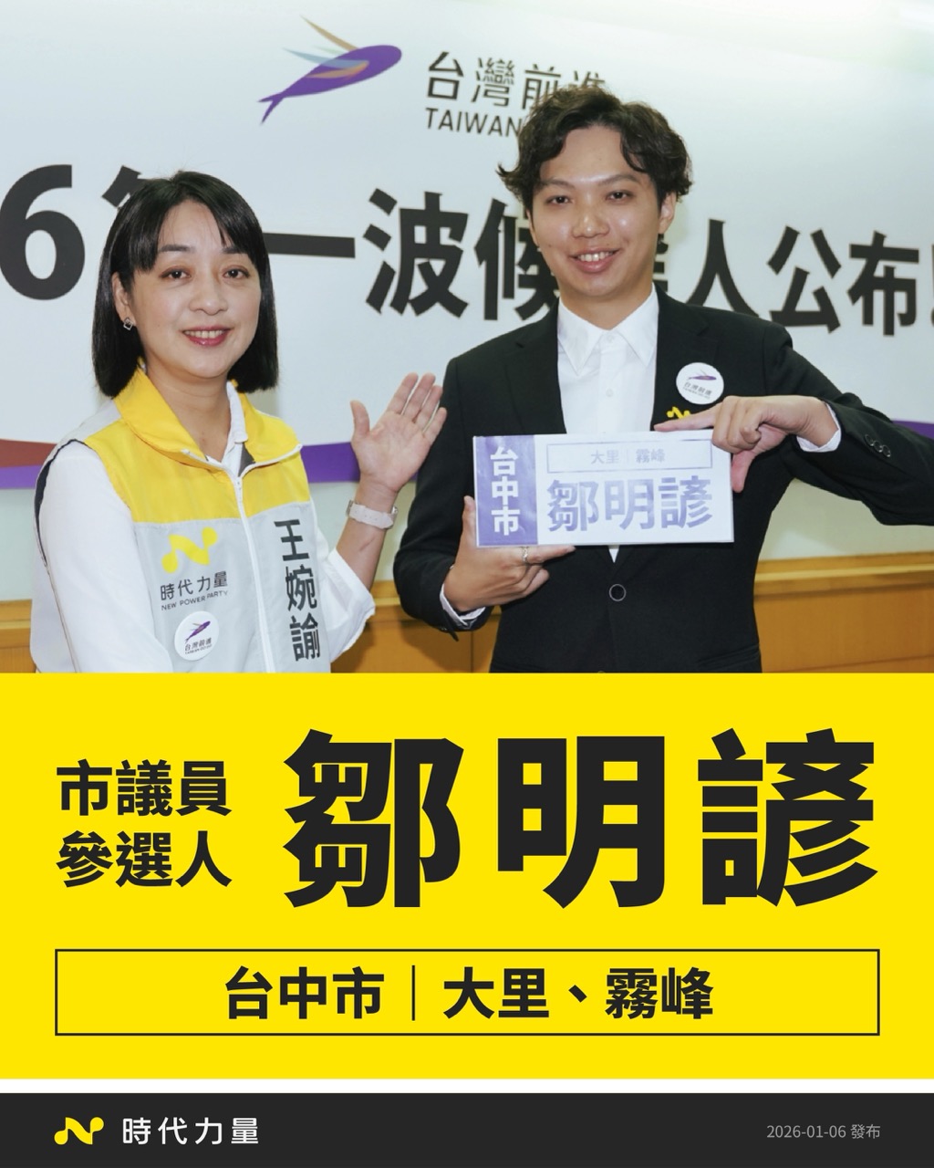 王婉諭說明,此次時代力量台中市大里霧峰區市議員候選人鄒明諺今年 30 歲,2022 年參選後並未離開地方,而是持續深耕基層,從居住正義、空氣污染到地方公共事務皆站在第一線,盼能將其送進台中市議會,為地方與城市發聲。