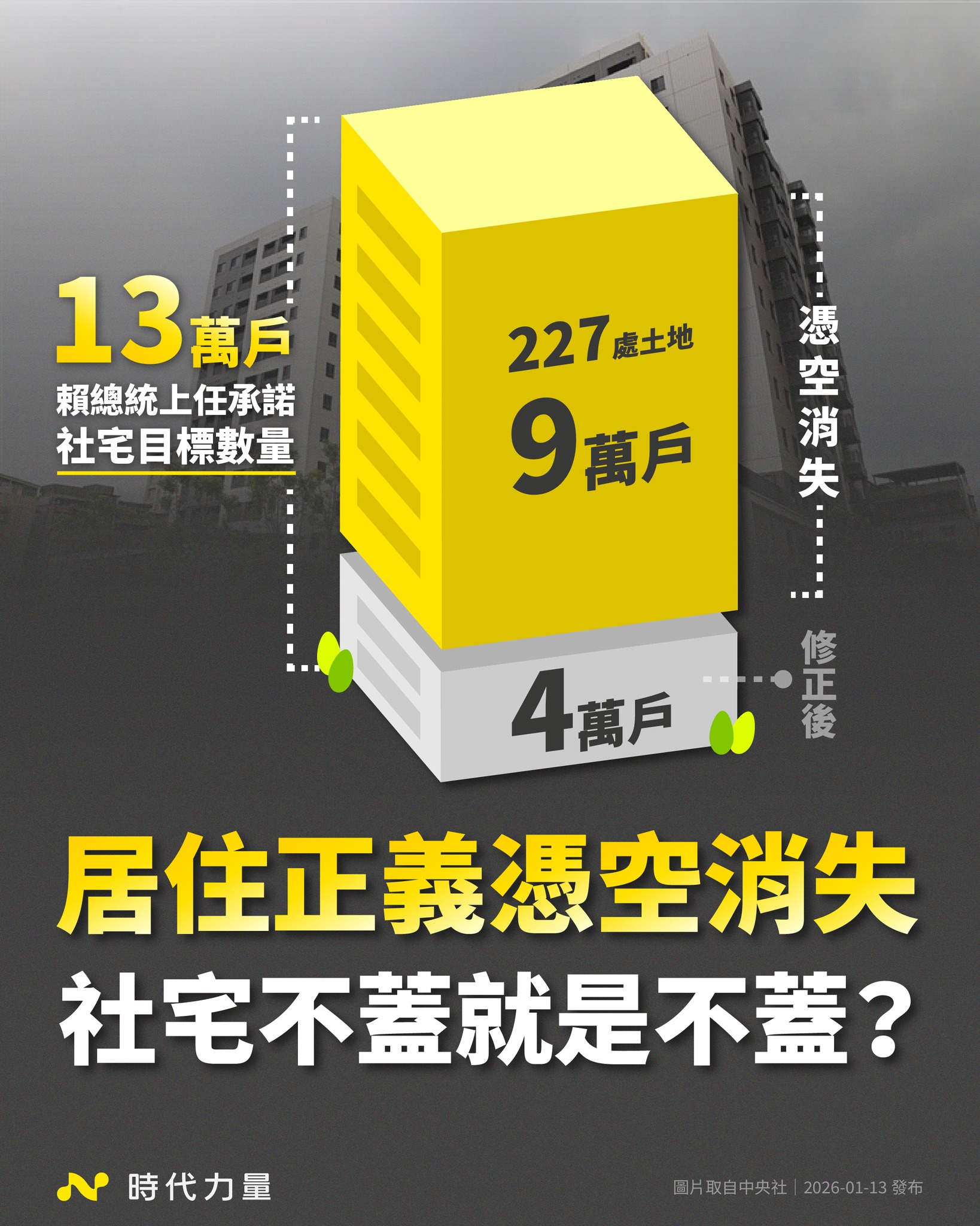 時代力量表示,為達成賴清德提出的 13 萬戶社宅目標,行政院曾要求未來市地重劃須保留 3% 至 5% 土地作為社會住宅使用;賴清德上任後,也曾宣布已盤點 227 處國公有基地,結合老舊宿舍改建,預計可興建 9 萬戶社宅。時代力量質疑,這些基地如今去向不明,政府至今未清楚交代。
