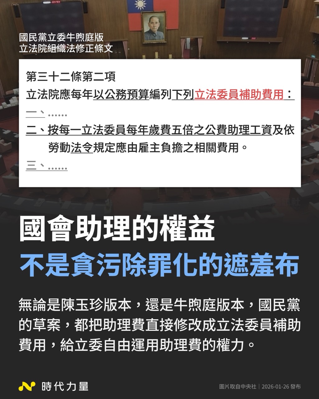 去年底,國民黨立委陳玉珍提出《立法院組織法》修正草案,引發國會助理強烈反彈與社會爭議,原案在輿論壓力下撤回,隨後改由牛煦庭提出新版草案並持續推動修法。對此,時代力量表示,國會助理的權益不應成為貪污除罪化的遮羞布,牛煦庭版的本質仍是企圖將詐領助理費的行為合法化,嚴重侵蝕民主與法治基礎。