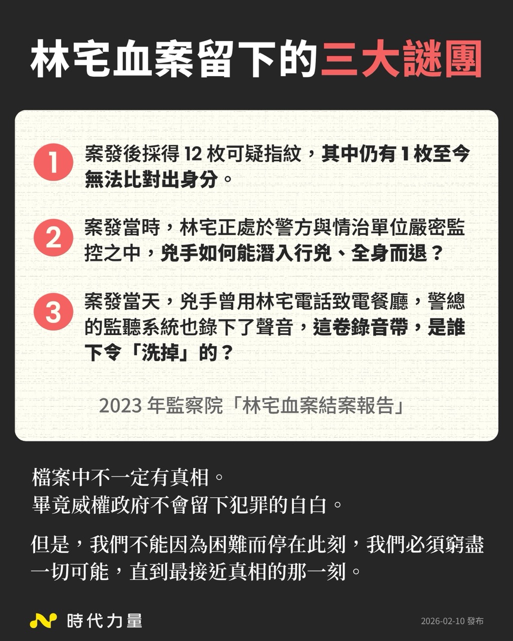 時代力量指出,民主化後,歷屆民進黨政府確實曾嘗試透過司法調查、成立促進轉型正義委員會,以及監察院重啟調查等方式釐清事實,這些努力值得肯定,但社會也必須誠實面對,真相仍然殘缺。監察院於 2023 年提出的最新調查報告,明確指出包括可疑指紋仍有無法比對者、在高度監控下兇手如何進出林宅並全身而退,以及兇手通話錄音遭人洗除等三大關鍵疑點,至今仍無法獲得合理解釋。