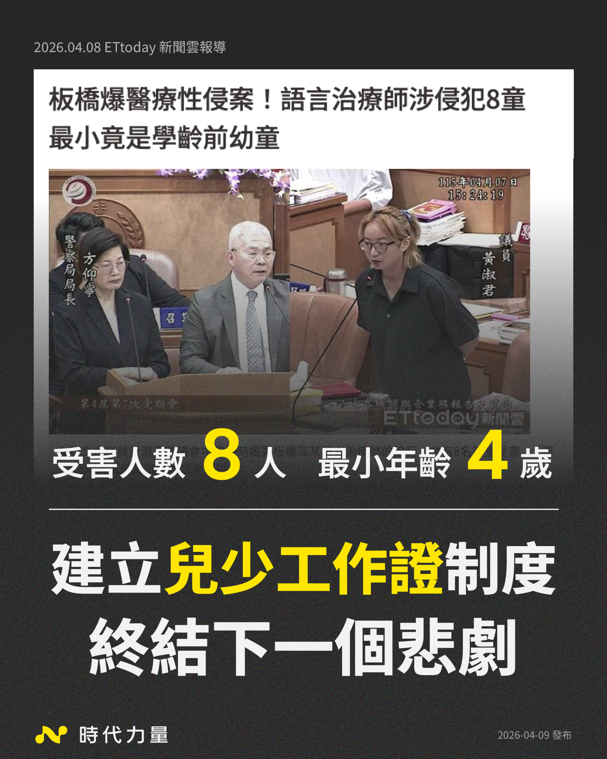 最後,時代力量呼籲,《兒少權法》修正已迫在眉睫,朝野立委與衛福部應共同支持將「兒少工作證」正式入法,讓制度走在犯罪前面,而不是每一次都在孩子受傷之後才亡羊補牢。