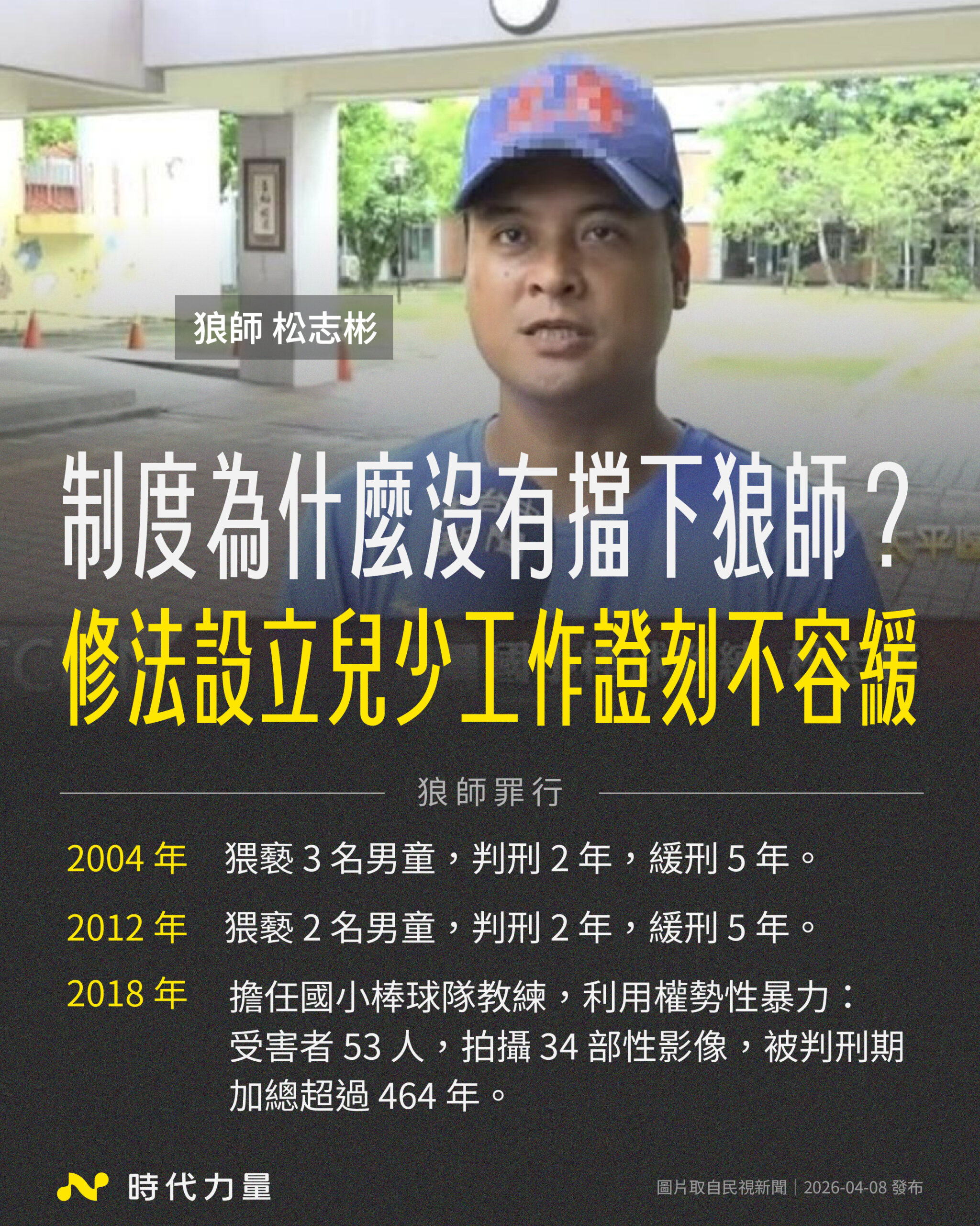時代力量指出,松志彬早在 2004 年及 2012 年即因猥褻男童遭判刑,卻靠著緩刑期滿「洗白」良民證,於 2018 年重新混入校園體系,自 2018 年起擔任台中某國小棒球隊教練期間,濫用權勢、以禁賽等手段要脅,對 53 名學童犯下性侵害,拍攝 34 部性影像,其中最小的受害者年僅 8 歲。一審判決書附表列出 90 筆犯罪事實,刑期加總高達 464 年。本該快樂打球的國小少棒隊,竟淪為孩子們的煉獄,這是不折不扣的人禍。