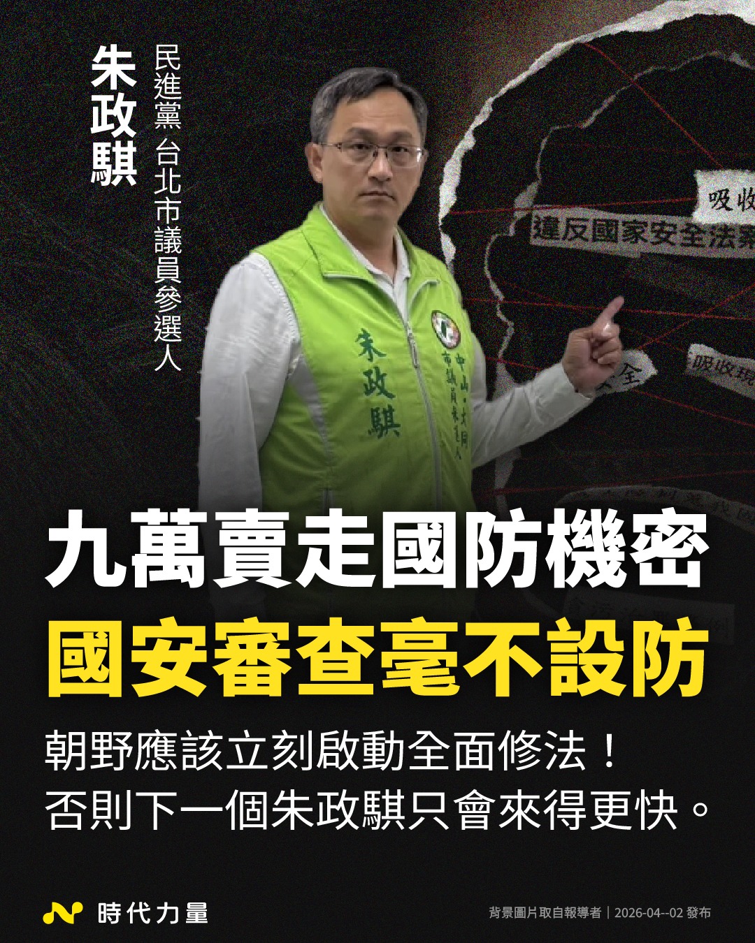 民進黨台北市議員參選人朱政騏今日遭依國家安全法洩密罪起訴,求刑五年以上。對此,時代力量今(2)日批評,民進黨的「零容忍、開除黨籍」是最基本的處理,真正的問題在於制度的系統性失守,從立委助理、行政院公關、外交部助理到總統府諮議,中共的滲透已遍及台灣政府各層,而現行安全查核制度對這些人幾乎毫無管束,形同虛設。時代力量強調,朝野應立即啟動「安全查核」的全面修法。